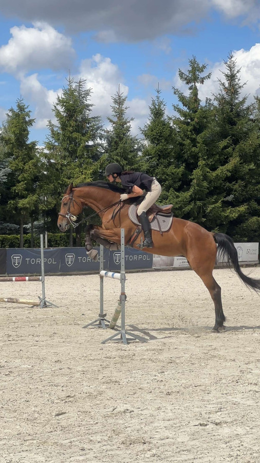 Klacz została zajeżdżona na początku tego roku, w treningu od 2 miesięcy więc nie jest wyeksploatowana. W domu naskakana do metra, w korytarzu do 145 włącznie. Nowe miejsca nie robią na niej żadnego wrażenia.