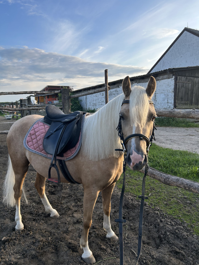 Kobyłka o cudownym charakterze, przyjaźnie nastawiona do dzieci, grzeczna przy zabiegach pielęgnacyjnych oraz prosta i przyjemna w jeździe. Nauczona pracy z ziemi. Zajeżdżona w 3 chodach oraz naskakana na małych przeszkodach. Kuc mimo młodego wieku nada się dla młodych adeptów jeździectwa :)