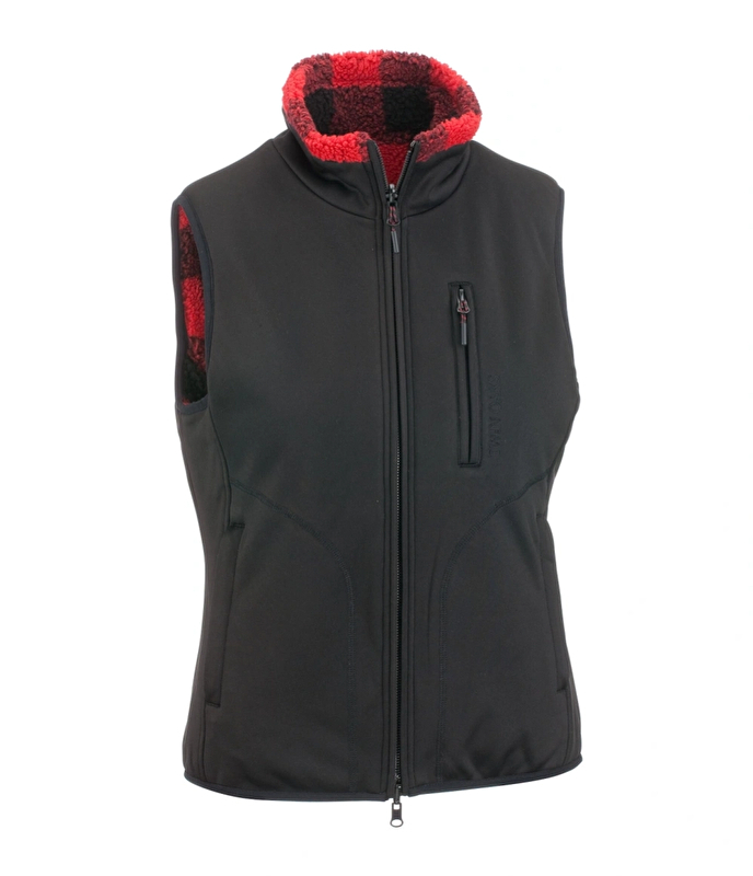 Dwustronna kamizelka ze stójką i jedną stroną wykonana z miękkiego, ciepłego materiału Sherpa w czarno-czerwoną kratkę, z 2 bocznymi kieszeniami do ogrzania dłoni. Druga strona wykonana jest z funkcjonalnego, wodoodpornego i wiatroszczelnego materiału softshell i posiada 2 boczne kieszenie zapinane na zamek oraz kieszeń na piersi zapinaną na zamek. Z dwukierunkowym zamkiem błyskawicznym z przodu.