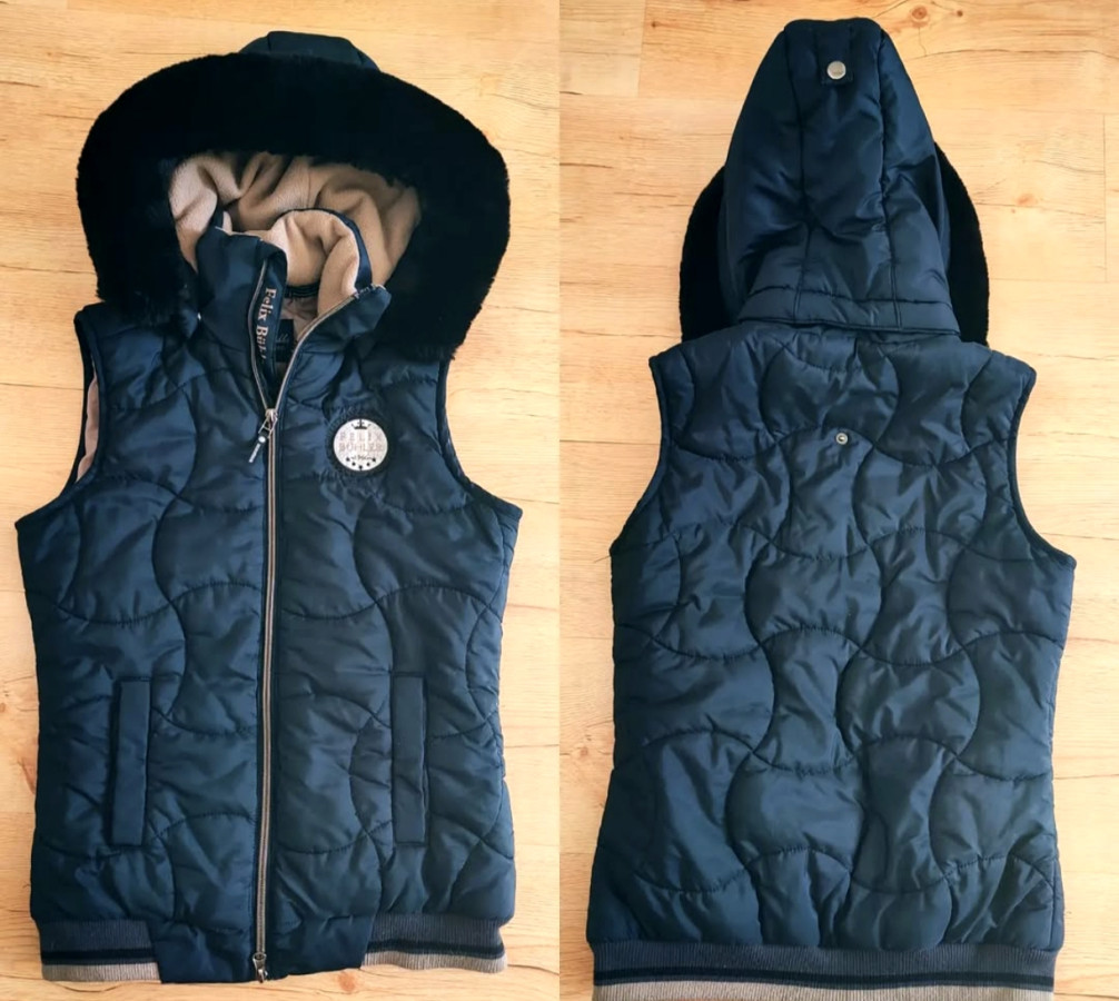 Kamizelka jezdziecka Felix Bühler. Granatowa. Z pięknym futrzanym kapturem. Wygląda mega i przyciąga wzrok. Jest ciepła. Softshellowa lekko przez co łatwa w czyszczeniu nie przyczepia się brud. Kaptur jest odpianany jest on w polarze. Kieszenie na napy. Ściągacze na dole. Super sprawa. Stan bardzo dobry. Rozm M szeroka 50 cm x2 dl całkowita od ramienia do 64 cm