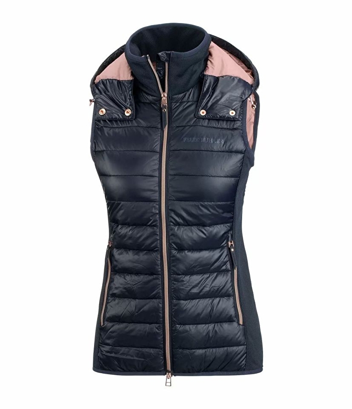 Lekka kamizelka jeździecka z kapturem i funkcjonalną cholewką z miękkiego nylonu. Wysokiej jakości wyściółka z imitacji puchu zapewnia miękki chwyt i dodatkowy komfort. Kołnierz i panele boczne ze strukturalnego polaru. Odpinany, regulowany kaptur, 2 przednie kieszenie na zamek, dwukierunkowy zamek z podszewką i nadruk Felixa Bühlera z przodu. Otwory na ramiona, kołnierz i dół są elastycznie obszyte. Materiał zewnętrzny 100% nylon, wstawki z polaru, 100% poliester.