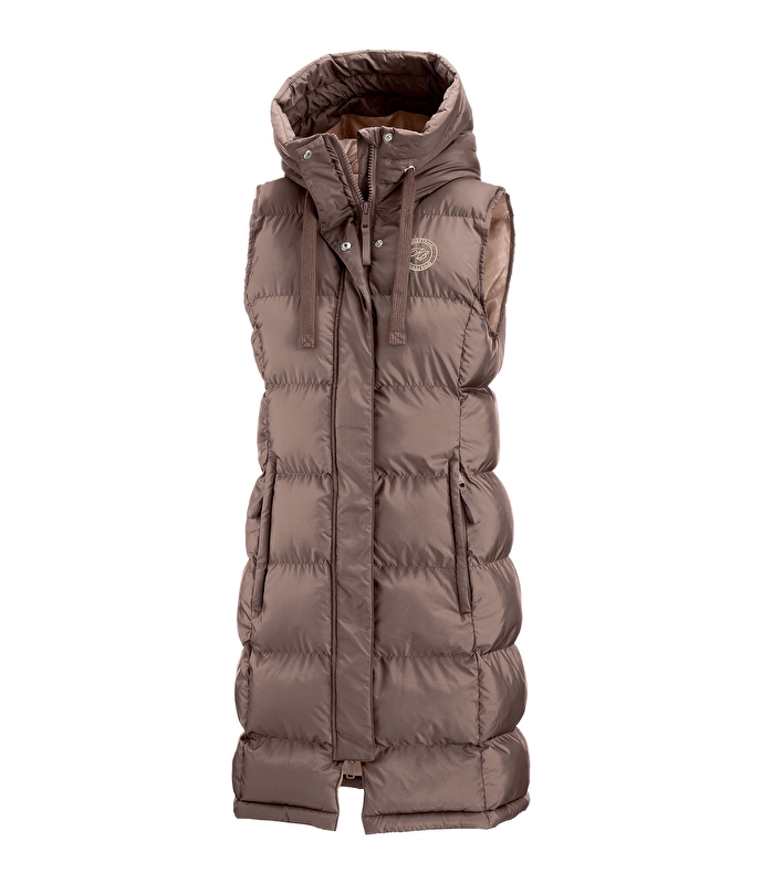 Długa kamizelka jeździecka z miękką wyściółką z imitacji puchu. Bardzo wysoki, regulowany, a także wyściełany kaptur, który można przypiąć z tyłu. Ukryty dwukierunkowy zamek błyskawiczny z przodu, 2 ukryte kieszenie na zamek z przodu wyłożone miękkim polarem. Długie, podszyte rozcięcie do jazdy konnej z zamkiem na plecach, wysokiej jakości haft Felix Bühler na piersi. 100% poliestru.