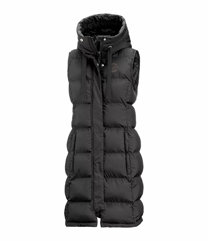 Długa kamizelka jeździecka z miękką wyściółką z imitacji puchu. Bardzo wysoki, regulowany, a także wyściełany kaptur, który można przypiąć z tyłu. Ukryty dwukierunkowy zamek błyskawiczny z przodu, 2 ukryte kieszenie na zamek z przodu wyłożone miękkim polarem. Długie, podszyte rozcięcie do jazdy konnej z zamkiem na plecach, wysokiej jakości haft Felix Bühler na piersi. 100% poliestru.