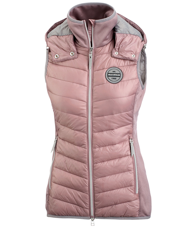 Lekka kamizelka jeździecka z kapturem i funkcjonalną cholewką wykonaną z miękkiego nylonu. Wysokiej jakości wyściółka z imitacji puchu zapewnia wyjątkowo wysoki poziom komfortu. Kołnierz i panele boczne wykonane ze strukturalnego polaru. Odpinany, regulowany kaptur, który można przypiąć również z tyłu. 2 kieszenie na zamek z przodu, dwukierunkowy zamek z przodu i znaczek Felix Bühler z przodu. Podkrój rękawa, kołnierz i dół obszyte gumką. Materiał wierzchni: 100% nylon, wstawki z polaru: 100% poliester.