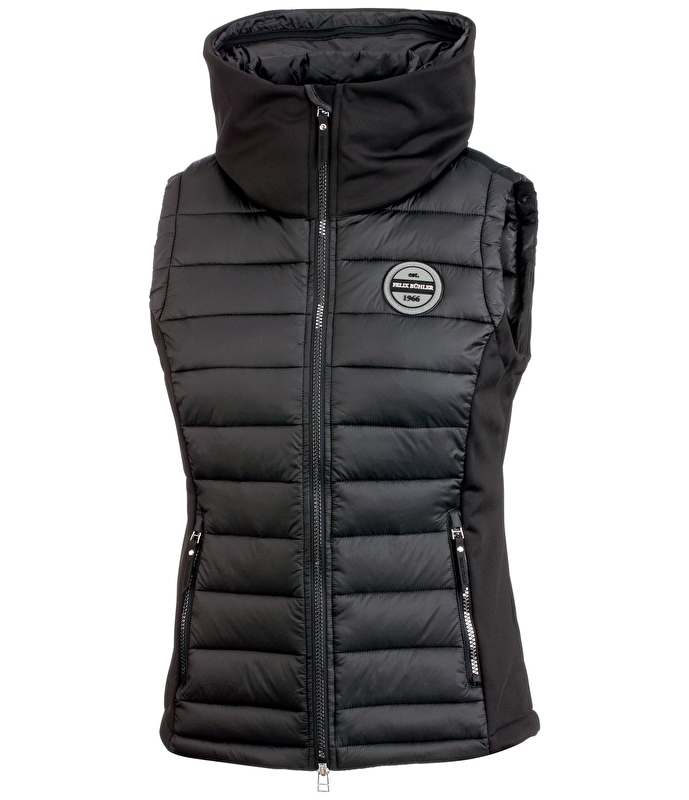 Niezwykle piękna kamizelka jeździecka wykonana z elastycznego materiału softshell i miękkiego pikowanego materiału. Podwójny kołnierz, chowany, pikowany kaptur w obszernym kołnierzu zewnętrznym z zamkiem błyskawicznym i pięknym haftem. Błyszczący, dwukierunkowy zamek błyskawiczny z przodu z osłoną podbródka i 2 kieszeniami na suwak z przodu oraz znaczkiem Felix Bühler na piersi. Przód, wewnętrzny kołnierz i kaptur 100% nylon, softshell 100% poliester.