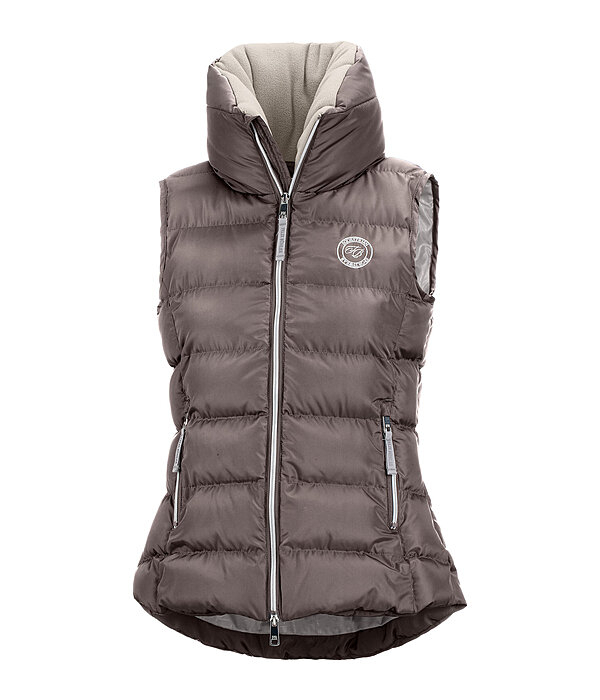 Sportowa i elegancka damska kamizelka jeździecka z wysoką stójką podszytą miękkim polarem. Ciepła wyściółka z imitacji puchu, dwukierunkowy zamek błyskawiczny z patką, 2 przednie kieszenie zapinane na zamek i jedna wewnętrzna kieszeń zapinana na zamek. Wysokiej jakości haft Felix Buhler na piersi. 100% poliestru.