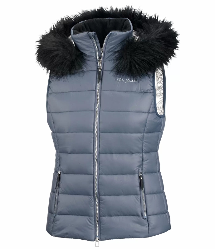 Super miła, ciepła pikowana kamizelka z miękkim wypełnieniem z imitacji puchu i efektownie błyszczącą podszewką. Kaptur posiada odpinane sztuczne futerko. Wysoki kołnierz podszyty przytulnym polarem, dwukierunkowy zamek z przodu i 2 przednie kieszenie na zamek.