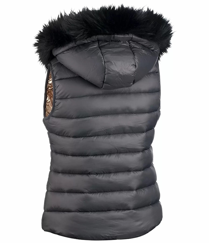 Super miła, ciepła pikowana kamizelka z miękkim wypełnieniem z imitacji puchu i efektownie błyszczącą podszewką. Kaptur posiada odpinane sztuczne futerko. Wysoki kołnierz podszyty przytulnym polarem, dwukierunkowy zamek z przodu i 2 przednie kieszenie na zamek.