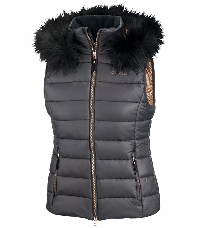 Super miła, ciepła pikowana kamizelka z miękkim wypełnieniem z imitacji puchu i efektownie błyszczącą podszewką. Kaptur posiada odpinane sztuczne futerko. Wysoki kołnierz podszyty przytulnym polarem, dwukierunkowy zamek z przodu i 2 przednie kieszenie na zamek.