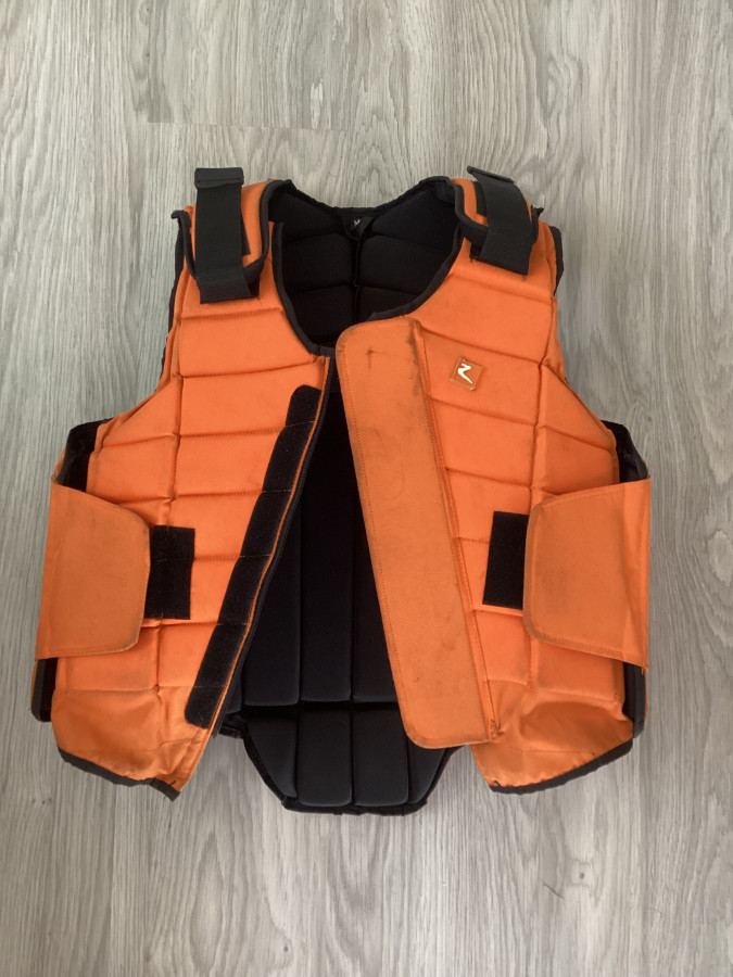 Sprzedam kamizelkę ochronną do jazdy konnej, stan dobry, wady to duże zabrudzenia widoczne na zdjęciach, wynikające z częstego użytkowania. Nigdy w niej nie spadłam, więc nie posiada żadnych ewentualnych przemieszczeń. Regulowana w wielu miejscach na rzepy, zapinana na rzep oraz zamek. Rozmiar M. Cena + koszt wysyłki (cena do negocjacji).