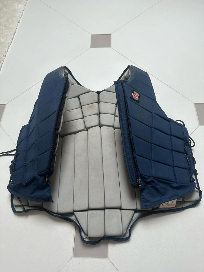 Sprzedam, granatową, kamizelkę ochronną, marki Alpha Horse. Rozmiar M (wymiary widoczne są na zdjęciach), regulowana szerokość za pomocą sznureczków- brak regulacji na ramionach). Stan widoczny jest na zdjęciach (uszkodzony suwak). Kamizelka spełnia normy bezpieczeństwa EN 13158:2000 Level 3. Cena 30 zł.