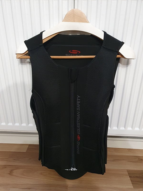 zapinana z przodu na zamek, natomiast po bokach posiada rzepy, dzięki którym kamizelkę można dopasować do jeźdźca
