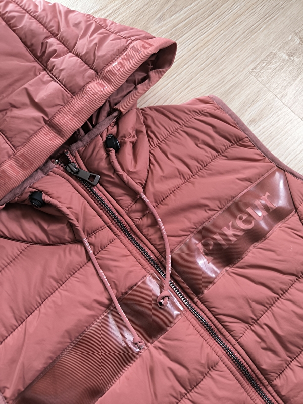 Kamizelka jezdziecka Pikeur. Lekko puchowa 100g wypełnienia. Przepięknie wykonana. Nowoczesny model. Kolor brudno różowy śliczny. Posiada logowania na kapturze, na piersi. Kaptur na stałe, z ścigaczami. Możesz go przyczepić do pleców w czasie jazdy. Kryte kieszonki i od wewnątrz. Zdecydowanie chwyta za oko i jest godna polecenia. Stan bardzo dobry. Rozmiar S