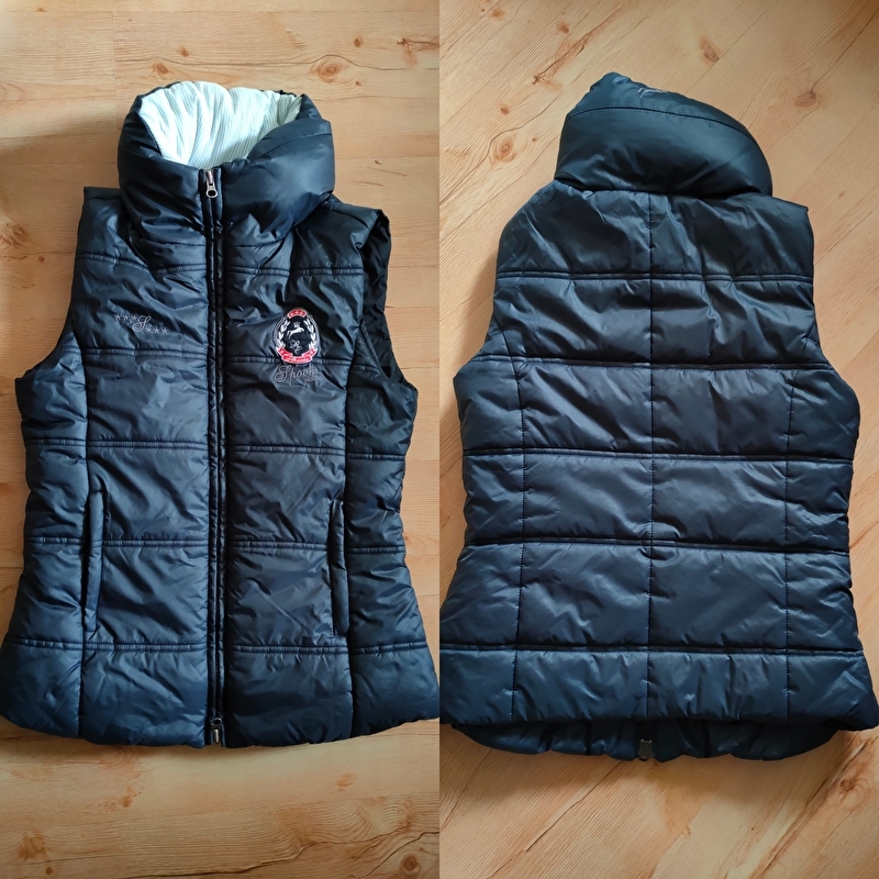 2. .Kamizelka jezdziecka Spooks. Granatowa, starszy model. Solidna Cieplutka z wysokim kołnierzem który fajnie utula i mimo że nie ma kaptura to zakrywa duza część głowy. Stan bardzo dobry do przeprania jest część wewnątrz ta jasna. Kieszenie na zamek. . Rozmiar XL szerokość 52 cm-54 cm x2 dl całkowita od ramienia 64 cm za 200 zł