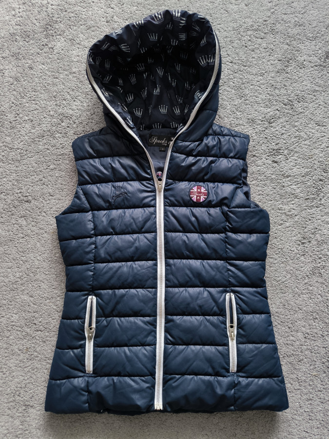 Kamizelka jezdziecka spooks..granatowa. średniej grubości. Bardziej pod lekkie. Kieszenie na zamek. Duży kaptur nie odpinany. Wygodna i godna polecenia. Stan bardzo dobry w jednej kieszeni wczpil się materiał od spodu trzeba sobie ogarnąć . Rozmiar S szerokość 45 cm x2 dl całkowita od ramienia 60 cm