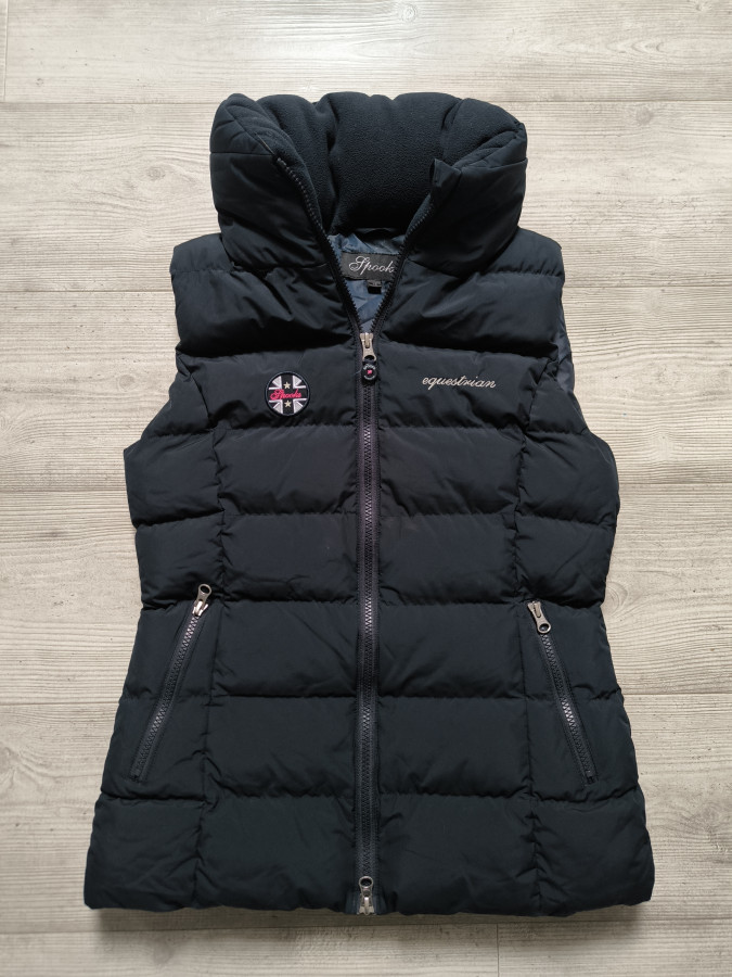 Kamizelka jezdziecka bezrękawnik Spooks. Granatowa. Nowszy model z wysokim kołnierzem który chroni bardzo dobrze. Podszyty polarem. Kieszenie na zamek w tym jedna dodatkowa po boku. Super odpowiednio ciepła. Stan bardzo dobry do ewentualnego przeprania. Rozmiar XS szerokość 44 cm x2 dl całkowita od ramienia 60 cm