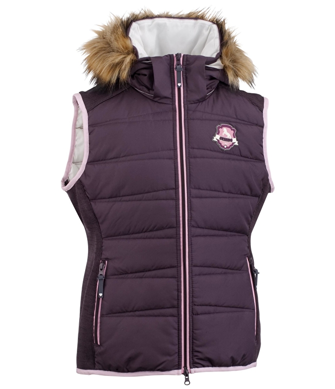 Stylowa kamizelka jeździecka z wyszukanym pikowaniem i elastycznymi dzianinowymi wstawkami dla optymalnej swobody ruchów podczas jazdy. Odpinany kaptur z obszyciem ze sztucznego futra, dwukierunkowy zamek z przodu, 2 przednie kieszenie na suwak. 100% poliestru.