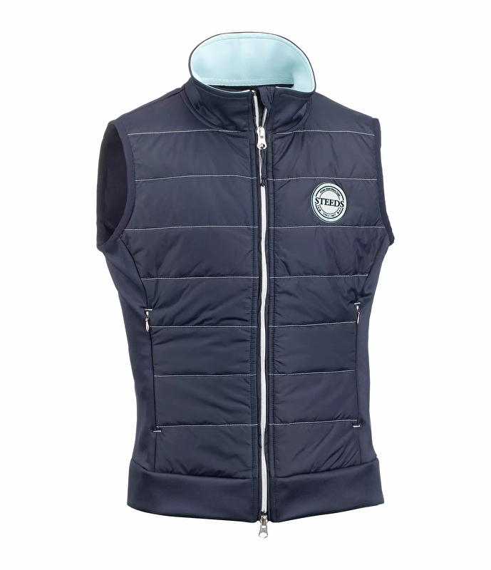 Lekka dziecięca kamizelka jeździecka łączy pikowany przód i elastyczne wstawki z boku i z tyłu. Stójka, naszywka z logo z przodu, 2 kieszenie na suwak, dwukierunkowy zamek błyskawiczny z przodu. Materiał wierzchni 100% nylon, wstawki 95% poliester, 5% elastan.