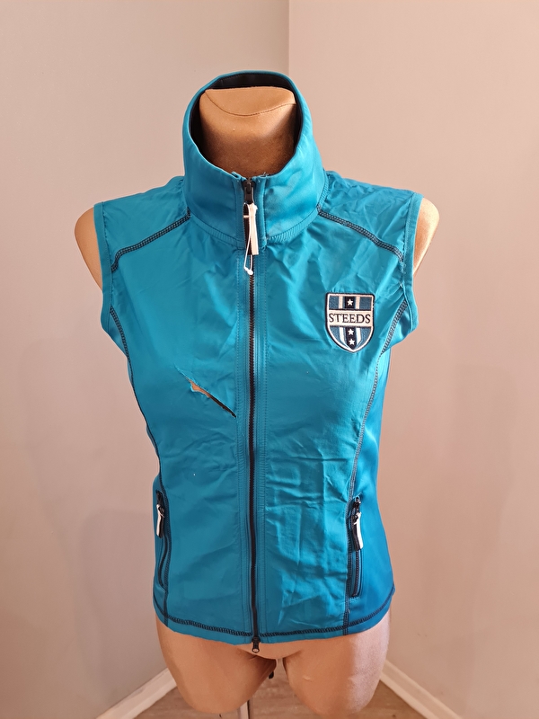 Funkcjonalna kamizelka jeździecka o kobiecym kroju, wykonana z elastycznego materiału typu stretch. Przednia część wykonana z wiatroodpornego nylonu. Oddychająca i szybkoschnąca. Naszywka z logo STEEDS na piersi. 2 kontrastowe kieszenie boczne na suwak, stójka, kontrastowy dwukierunkowy zamek z przodu. 95% poliester, 5% elastan, przednia część 100% nylon.