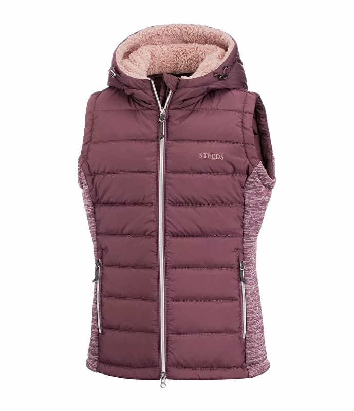 Super miła dziecięca kamizelka jeździecka z lekką wyściółką z imitacji puchu połączoną z miękkimi, elastycznymi wstawkami z polaru po bokach. Pod spodem 2-kierunkowy zamek błyskawiczny z osłoną podbródka, 2 przednie kieszenie zapinane na zamek i nadruk STEEDS na piersi. Kaptur jest regulowany, podszyty miękkim pluszowym futerkiem i można go przypiąć z tyłu za pomocą zatrzasku. 100% poliestru.