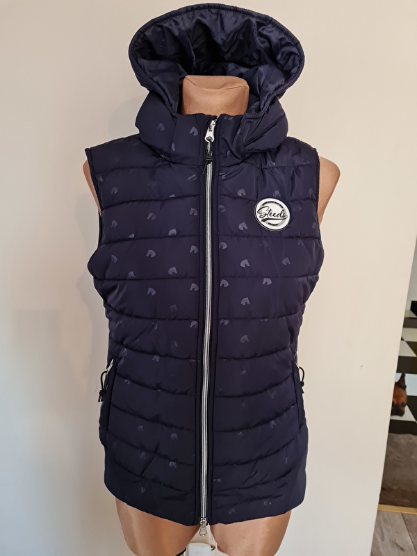 Fajna młodzieżowa kamizelka jeździecka z kapturem w połyskujący wzór głowy konia z ciepłą podszewką z imitacji puchu. Odporna na wodę i wiatr. Naszywka z logo na piersi, 2 wpuszczane kieszenie z zamkiem błyskawicznym z przodu, dwukierunkowy zamek z przodu, prążkowane mankiety u dołu. Odpinany kaptur.
