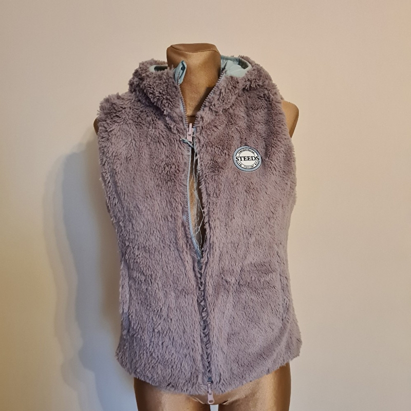 Świetna kamizelka jeździecka dla dzieci dwustronna. Z przytulnym pluszowym futerkiem po jednej stronie i nowoczesnym pikowaniem po drugiej stronie. Logo można zobaczyć po obu stronach. Kontrastowy dwukierunkowy zamek z przodu i 2 kieszenie na suwak. 100% poliestru.