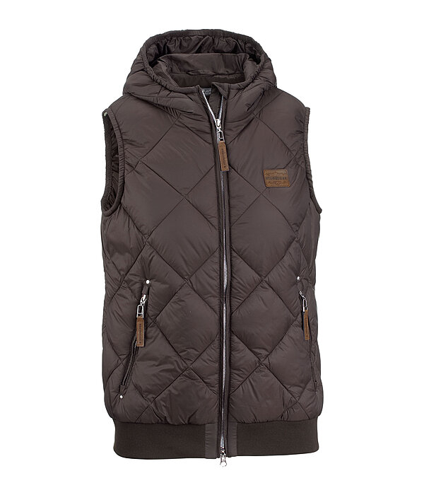Odporna na wiatr i oddychająca pikowana kamizelka z kapturem i aplikacjami ze sztucznej skóry. Dwie kieszenie zapinane na zamek, dwukierunkowy zamek, elastyczne mankiety. Kaptur można zapiąć z tyłu na zatrzask. 100% nylonu.