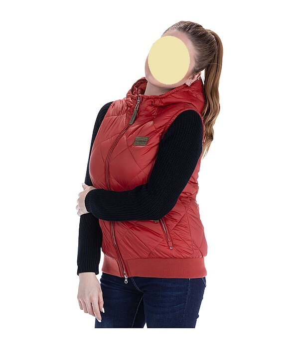 Odporna na wiatr i oddychająca pikowana kamizelka z kapturem i aplikacjami ze sztucznej skóry. Dwie kieszenie zapinane na zamek, dwukierunkowy zamek, elastyczne mankiety. Kaptur można zapiąć z tyłu na zatrzask. 100% nylonu.