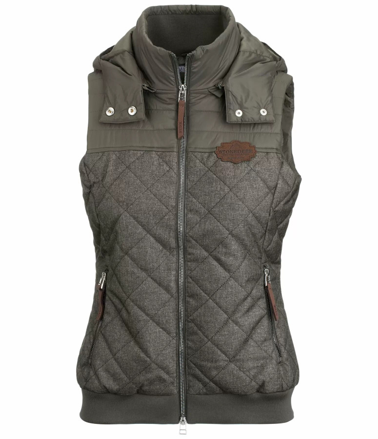 Modna pikowana kamizelka z odpinanym kapturem wykonana z wiatroodpornej mieszanki materiałów. Całość dopełniają srebrne zamki błyskawiczne i aplikacje ze skóry syntetycznej. Elastyczny dół, dwukierunkowy zamek, 2 kieszenie na suwak. Materiał wierzchni 1: 100% nylon, materiał wierzchni 2: 100% poliester, podszewka 100% poliester.
