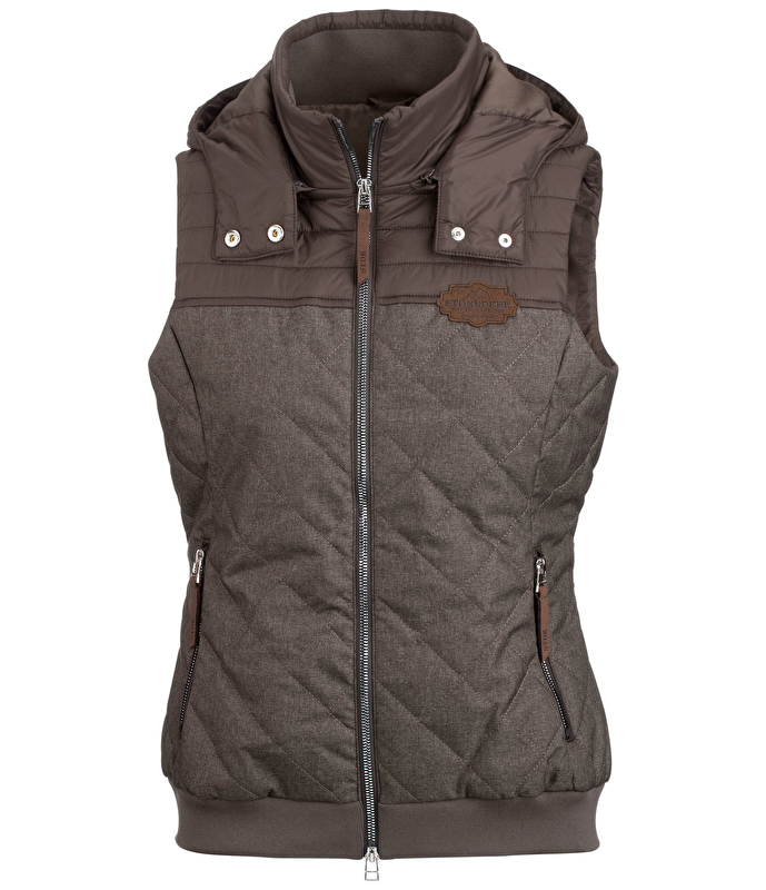 Modna pikowana kamizelka z odpinanym kapturem wykonana z wiatroodpornej mieszanki materiałów. Całość dopełniają srebrne zamki błyskawiczne i aplikacje ze skóry syntetycznej. Elastyczny dół, dwukierunkowy zamek, 2 kieszenie na suwak. Materiał wierzchni 1: 100% nylon, materiał wierzchni 2: 100% poliester, podszewka 100% poliester.