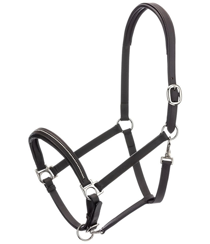 Dyskretnie zdobiony kantar wykonany z olejowanej skóry z rzędem małych, białych dżetów na nachrapniku i miękkiej wyściółce z prawdziwej skóry na nachrapniku i pasku na szyję dla optymalnego komfortu. Łatwo regulowane paski na szyi i brodzie. Okucia w kolorze srebrnym.