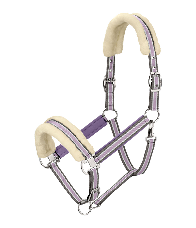 Sportowy kantar z przyjemnie miękkim misiem wyściełanym z polaru na szyi i nosku oraz wyściółką z miękkiej gumy chloroprenowej na paskach policzkowych. Modny, trójkolorowy wzór w paski. Łatwo regulowane paski na szyję i podbródek. Okucia w kolorze srebrnym. 100% polipropylen.