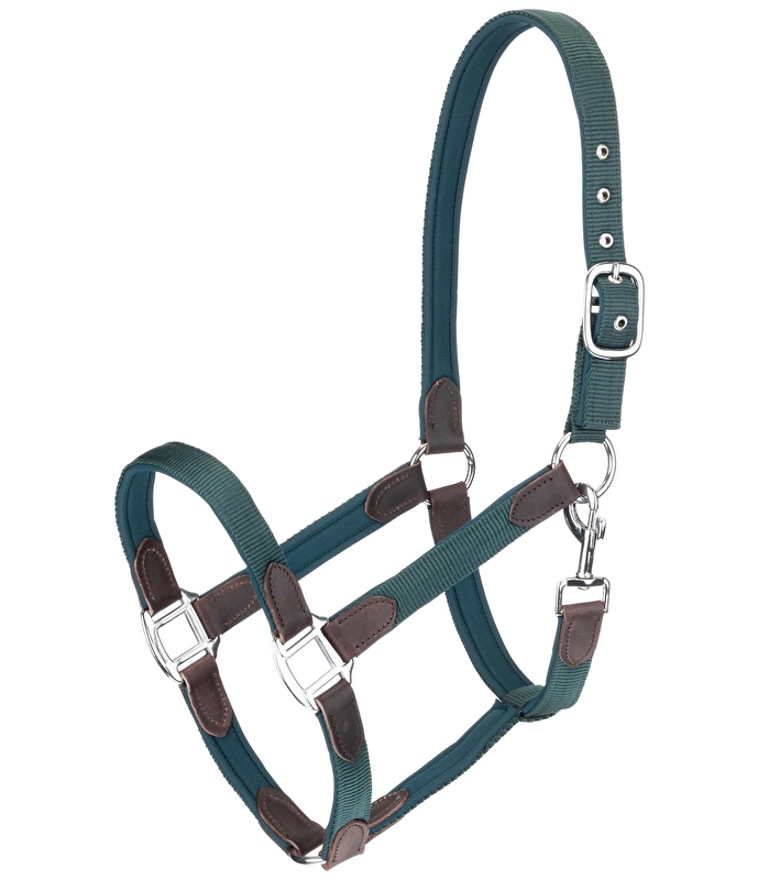 Wysokiej jakości kantar ze skórzanym obrzeżem dla szczególnie eleganckiego wyglądu. Pasuje do liny ołowiowej Kate. Pasek na szyję i wyściółka nosa. Łatwo regulowany pasek na szyję. Okucia w kolorze srebrnym. Kantar 100% polipropylen, poduszka 100% guma chloroprenowa.