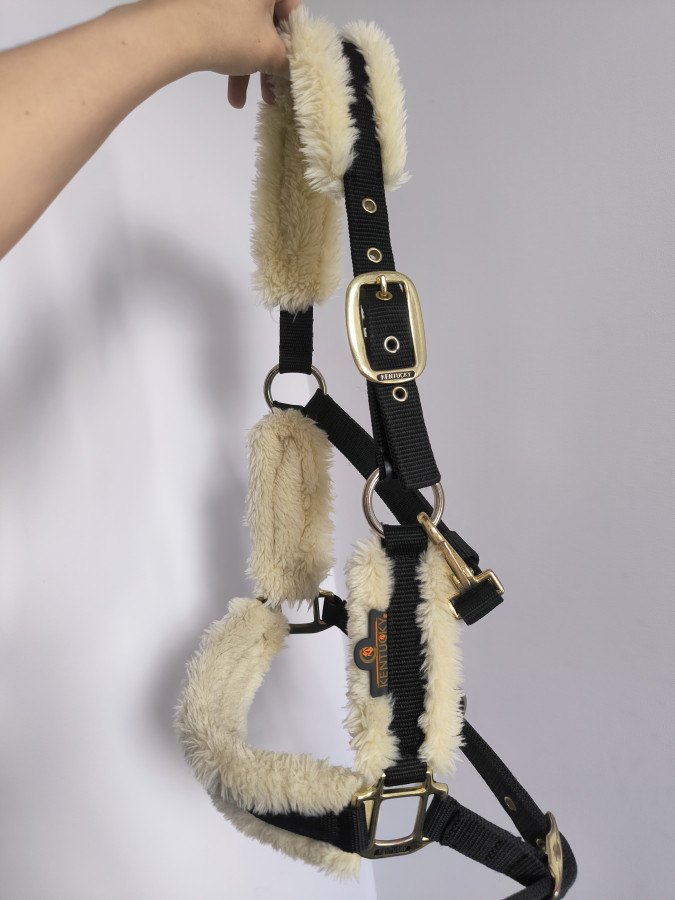 Kantar dla kucyka pony. Piękny. Czarny z jasnym futerkiem. Jest regulacja z jednej strony. Nie obciera pyska i ładnie się prezentuje. Stan jest bardzo dobry uważam. Zadbany. Futerko również w super stanie. Być może był założony raz i wyprany. Nie posiada wad. Piękne złote okucia