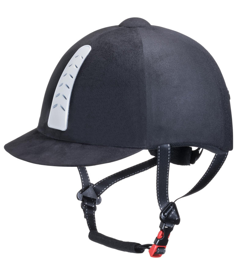Sportowy kask jeździecki KNIGHTSBRIDGE z pokrętłem do regulacji rozmiaru z tyłu w celu dopasowania do indywidualnego rozmiaru głowy. Dodatkowo w zestawie dwie wkładki wewnętrzne, które gwarantują idealne dopasowanie zarówno do owalnych, jak i okrągłych głów. Wloty powietrza z przodu i wylot powietrza z tyłu zapewniają optymalną cyrkulację powietrza. Maksymalna ochrona dzięki odpornej na uderzenia zewnętrznej powłoce ABS i amortyzującej wstrząsy powłoce wewnętrznej EPS. Wyściełana ochrona podbródka i szyi. Oddychająca podszewka wewnętrzna jest wyjmowana i nadaje się do prania. Odpowiada aktualnie obowiązującemu standardowi kasków jeździeckich.