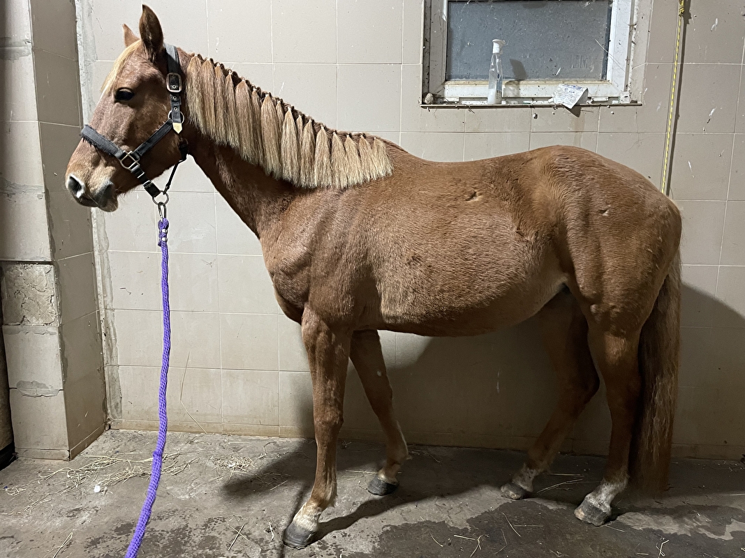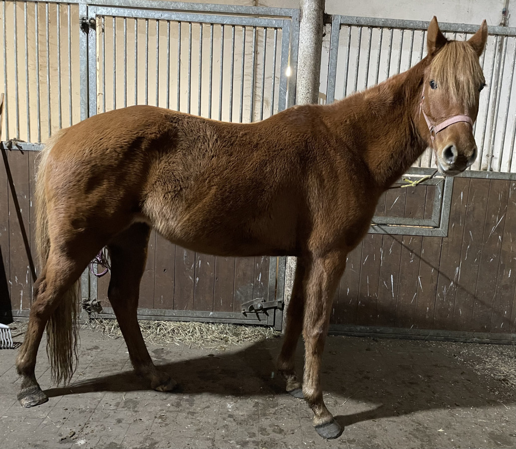 Kasztanowa klacz w typie szlachetnym urodzona w 2019r, mierzy 154cm. Posiada paszport NN, zarejestrowana w ARiMR. Surowa (nauczona podawania nóg, grzecznie stoi przy czyszczeniu, obeznana z myjką i wchodzeniem do przyczepy). Bosa, utrzymywana w chowie wolnowybiegowym (do stania w boksie też nauczona). Bez narowów i nałogów. Klacz posiada nieestetyczną bliznę na nodze, która nie wyklucza jej z pracy pod siodłem. Stoi w okolicy miejscowości Leszno w woj. Wielkopolskim