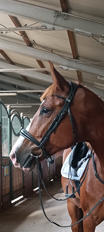 Sprzedam ogłowie wykonane z wysokiej jakości, niezwykle miękkiej skóry. Nachrapnik oraz pasek potyliczny miękko podszyte skórą. Naczółek opadający, ozdobiony srebrnymi oraz czarnymi kryształkami (brak niektórych kryształków). Ogłowie posiada całkowicie wypinany skośnik (brak skośnika - gdzieś mi zaginął). Anatomicznie profilowany pasek potyliczny dla większego komfortu. Ogłowie sprzedaję bez wodzy. Ogłowie posiada ślady powstałe w wyniku użytkowania - wszystko widoczne na zdjęciach. Kolor czarny rozmiar Cob.