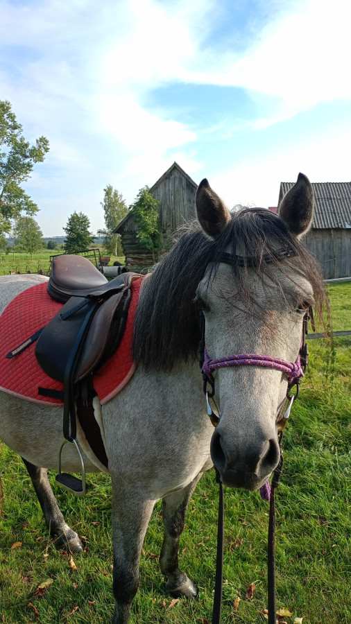 Konik ma około 135 w kłębie, ciekawska, odważna, szuka kontaktu z człowiekiem, w sierpniu bezproblemowo przyjęła jeźdźca.