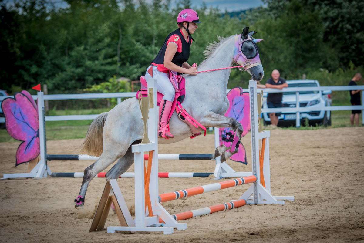 Była kilka razy na zawodach (do 60cm), przy dobrym prowadzeniu bardzo ładnie skacze, idzie równo i pewnie. Przy regularnym treningu będzie z niej bardzo fajny koń do skoków.