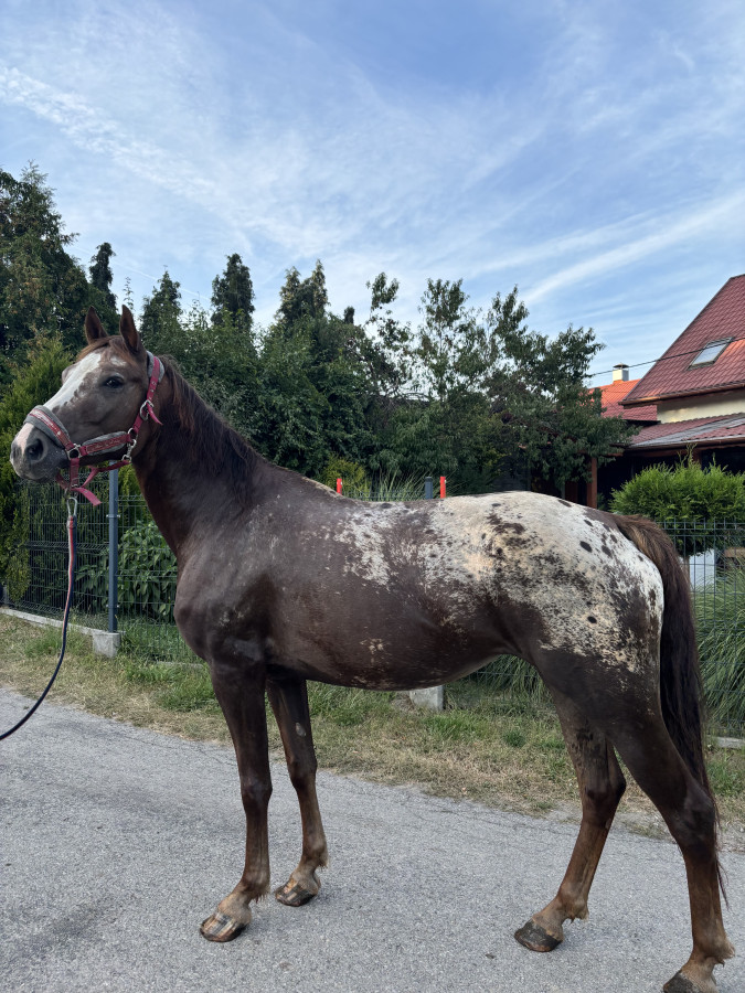 sprzedam bardzo urodziwą 6 letnia klacz rasy Apalosa bezproblemowa w obsłudze,podaje wszystkie nogi, poprawnie chodzi na lonży, z charakteru totalny misiek, bez problemu chodzi w nowe miejsca, przechodzenie obok nowych koni nie robi na niej totalnie wrażenia, w trakcie zajeżdżania, przyjęła jeźdźca bez problemowo, dopiero pracujemy nad poruszaniem się w 3 chodach pod siodłem ale bardzo szybko się uczy, reaguje idealnie na głos, zdrowa nie miała u mnie żadnych kontuzji, nigdy kulała, nie tka, nie łyka, podsumowując totalny spokój i bardzo duży potencjał.