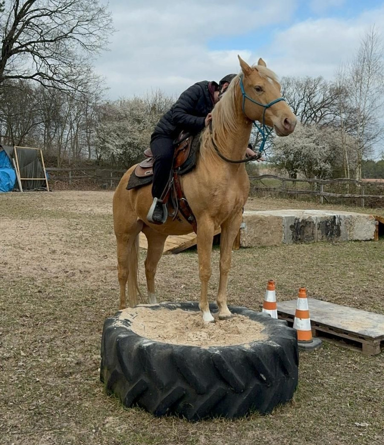 5 letnia klacz AQH, czyli Quarter Horse, pełen papier, pochodzenie reiningowo cuttingowe, panel badań. Umaszczenie złoty szampan, czyli sierść ma złoty połysk, a na różowej skórze są czarne kropeczki. Zajeżdżona naturalnie, na kantarku, chodzi w tereny, przez mostki i wiszące sznurki. Odważna, współpracująca. Chcemy dla niej znaleźć kobietę lub dziewczynę, która ją pokocha i będzie dobrze traktować.