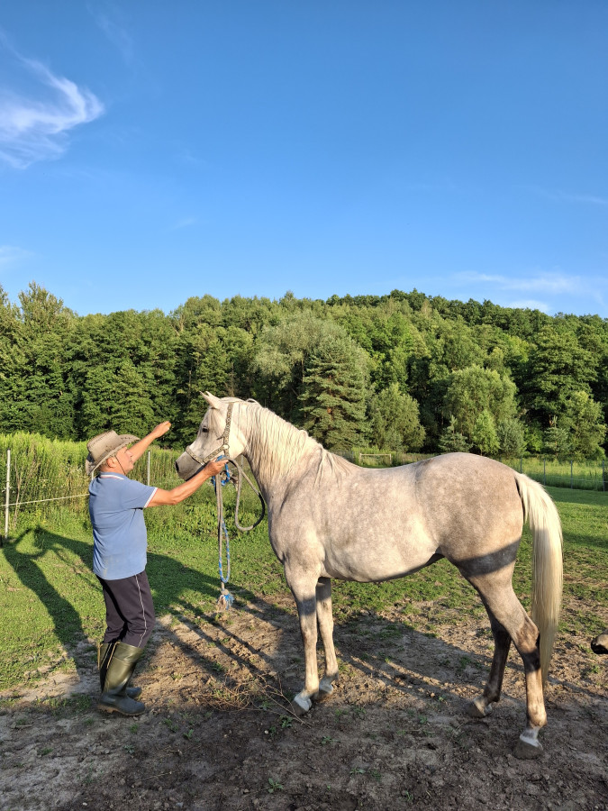 EASTER to 4,5 letnia klacz arabska, maści siwej o świetnym pochodzeniu. Klacz dobrze zbudowana. Ma piękny ruch. Regularnie werkowana i odrobaczana. Przyzwyczajona do obecności innych zwierząt. Świetnie nadaje się na klacz hodowlaną lub do rekreacji.