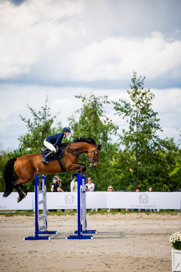 Klacz mająca doświadczenie w konkursach do 140 cm. Pomagająca w parkurze, zawsze po drugiej stronie, nie boi się podmurówek ani kolorowych przeszkód, ma za sobą konkursy przy sztucznym oświetleniu. Wyróżnia się swoim usposobieniem, jest bardzo grzeczna, bezpieczna zarówno w jeździe jak i obejściu. W parkurze daje dużo spokoju, równo galopująca. Dobry koń, aby wjeździć się w wyższe konkursy ze spokojną głową. Przy pomyłkach jeźdźca ,,nic nie bierze sobie do głowy'' ;).