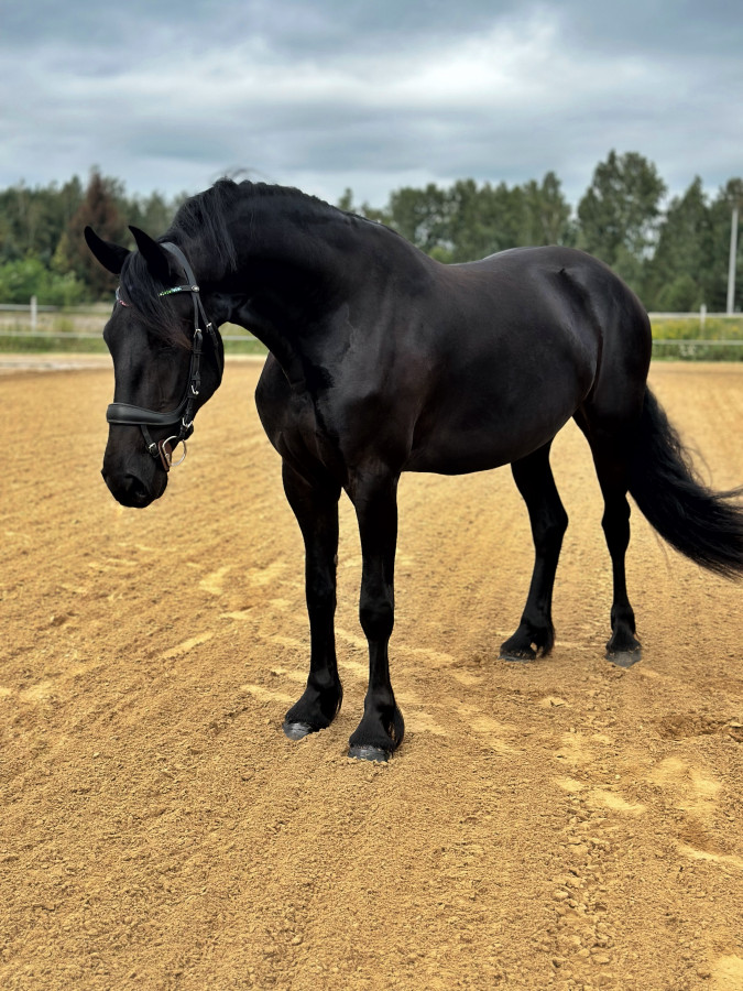 Klacz fryzyjska, 3,5 roku gotowa do rozpoczęcia pracy pod siodłem. Przyjęła jeźdźca. Od niedawna lonżowana. Padokowana jak najdłużej, nawet całodobowo. Bardzo przyjacielska, grzeczna przy zabiegach pielęgnacyjnych (nie boi się spryskiwaczy), kowalu, kąpaniu, weterynarzu. Regularnie odrobaczana, werkowana, szczepiona. Zęby robione w tym roku.