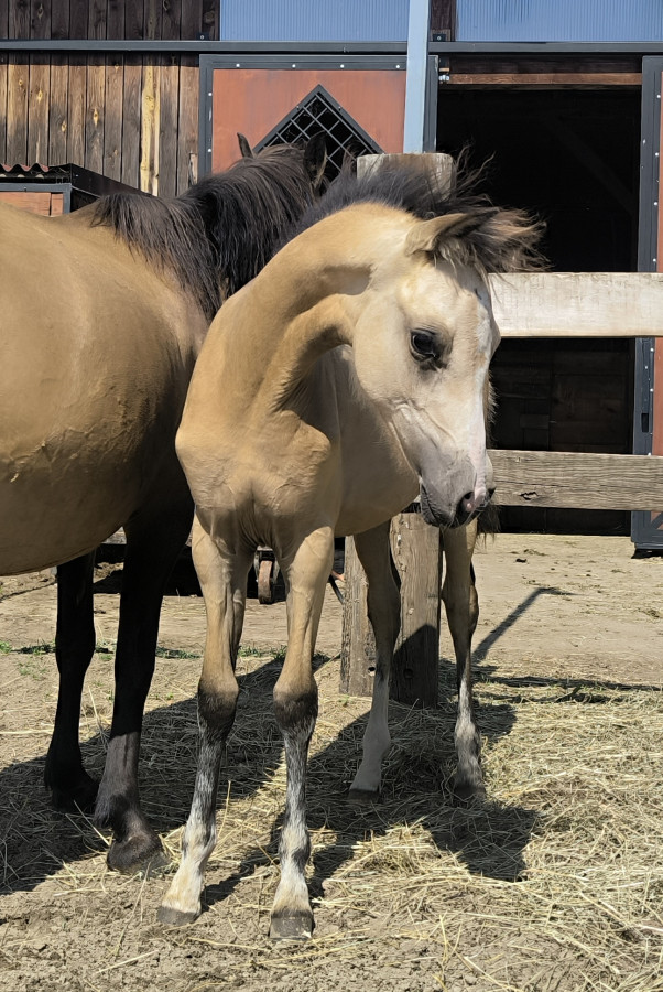 Klacz bardzo poprawna o długich liniach, bardzo żeńska, zapowiada się na dużego kuca. Rodzice użytkowani skokowo.
