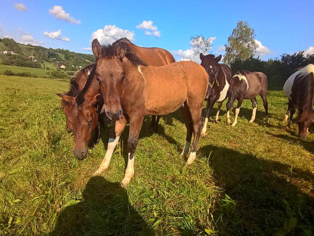 OPOKA - SOLO, ur. 12.05.2025r., maść: gniada. Zapowiada się na rosłą klaczkę, spokojna, towarzyska. Cena: 3500zł