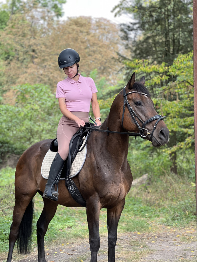 Mam ją odkąd skończyła 3,5roku. Zarejestrowana w PKWK. Ponad 2 lata temu przeszła kontuzję, aktualnie w niczym jej to nie przeszkadza oprócz względów estetycznych oraz wymaga dłuższego rozstępowania przed jazdą niż 5 minut. Kuta na przody, pod opieką fizjoterapeuty. Ostatnie miesiące pracujemy z ziemi, wsiadana sporadycznie, od miesiąca wdrażamy się do treningów. Reaguje na pomoce jak i na głos. Porusza się w trzech chodach, skacze małe przeszkody ze względu na mój strach, a nie jej brak możliwości. Nie wyeksploatowana w życiu. W hierarchii stada jest po środku, stara się nie wchodzić w konflikty, stoi na uboczu. Zmiana stada nie robi na niej wrażenia. W nowym miejscu jest spokojna i opanowana. Nie rzuca się na inne konie, a jeśli ktoś ją atakuje to po prostu ucieka zamiast oddawać.