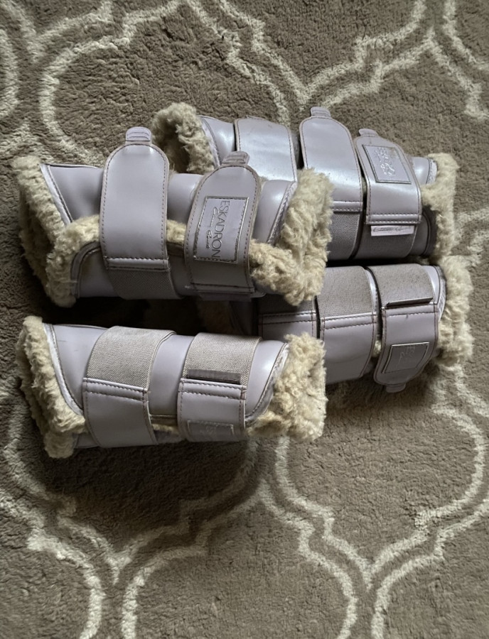 Na sprzedaż komplet ochraniaczy z limitowanej kolekcji Eskadrona, kolor lilia, rozmiar typowy full (M przód i L tył) , posiadają normalne ślady, mimo krótkiego używania - odrobinę sierści na miśku, lekkie otarcia na zewnątrz, oprócz tego w pełni sprawne, rzepy bardzo dobrze trzymają. Sprzedaż tylko w komplecie.