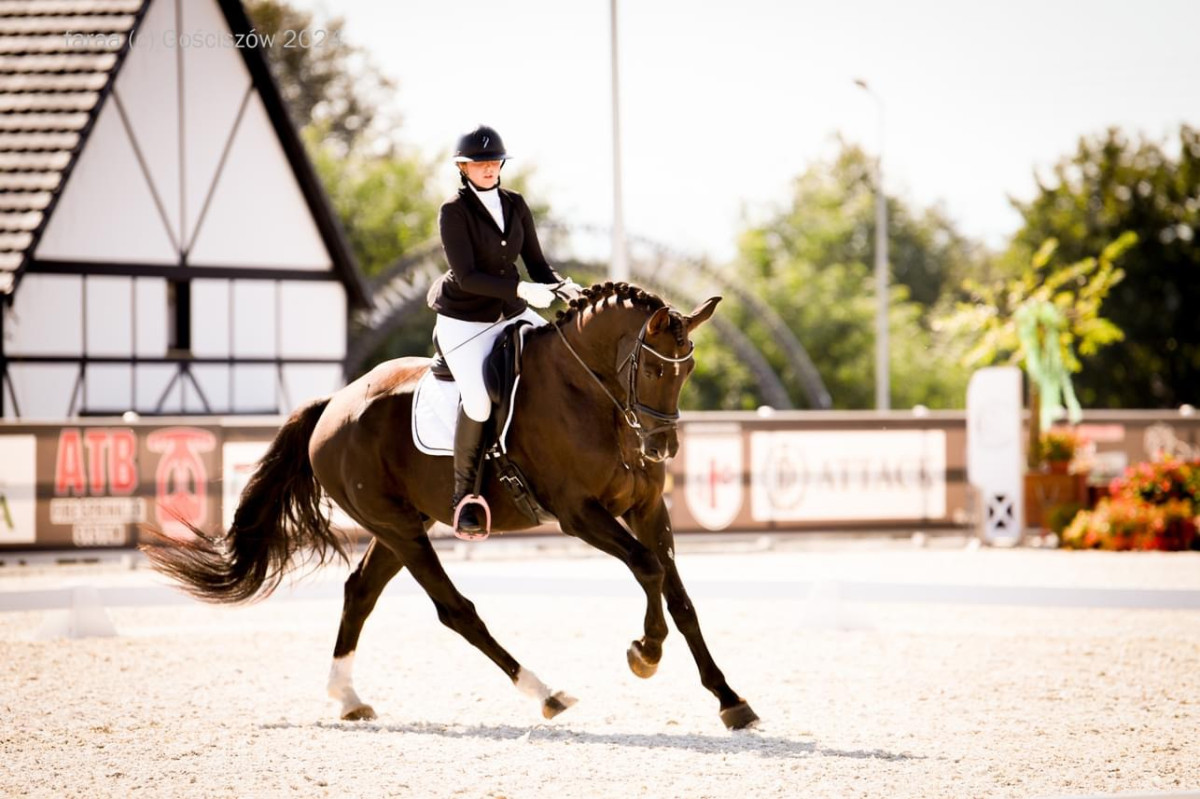 Koń bez narowów, bardzo ambitny. Startujący i wygrywający w klasach (L,P,N). Koń w ciągłym treningu od Marca tego roku u jeźdźca Grand prix , aktualnie uczy się zmian lotnych. Z wielką łatwością do piafu. Na ostatnich zawodach w klasie N wyniki 64-67% dające podium każdego dnia. Od 4 roku życia w jednych rękach. Sprzedaje z powodu wyjazdu na studia.