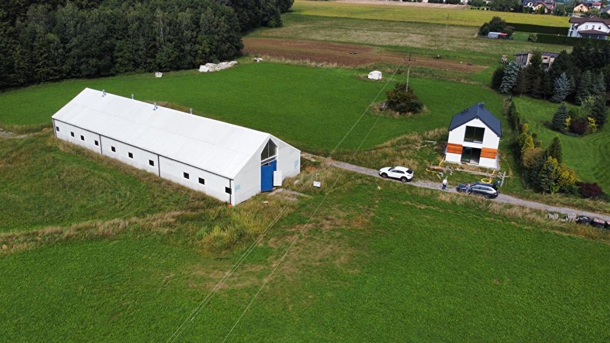 Hala na stajnię z projektem, nowa. Sprzedam halę o stalowej konstrukcji przystosowanej do 3 strefy śniegowej i wiatrowej z projektem. Pokryta jest poliuretanową płytą warstwową o grubości 15 cm na dachu i 10 cm na ścianach bocznych. Wymiary :12x40x7,22 m (wysokość ściany bocznej i drzwi 3,5 m). 2 pary szerokich drzwi dwuskrzydłowych po obydwu stronach, okna inwentarskie. Obecnie stoi w okolicach Bielska-Białej (gm. Jasienica). Proszę o kontakt telefoniczny w weekend cały dzień, lub w tygodniu w godz. 19-21.